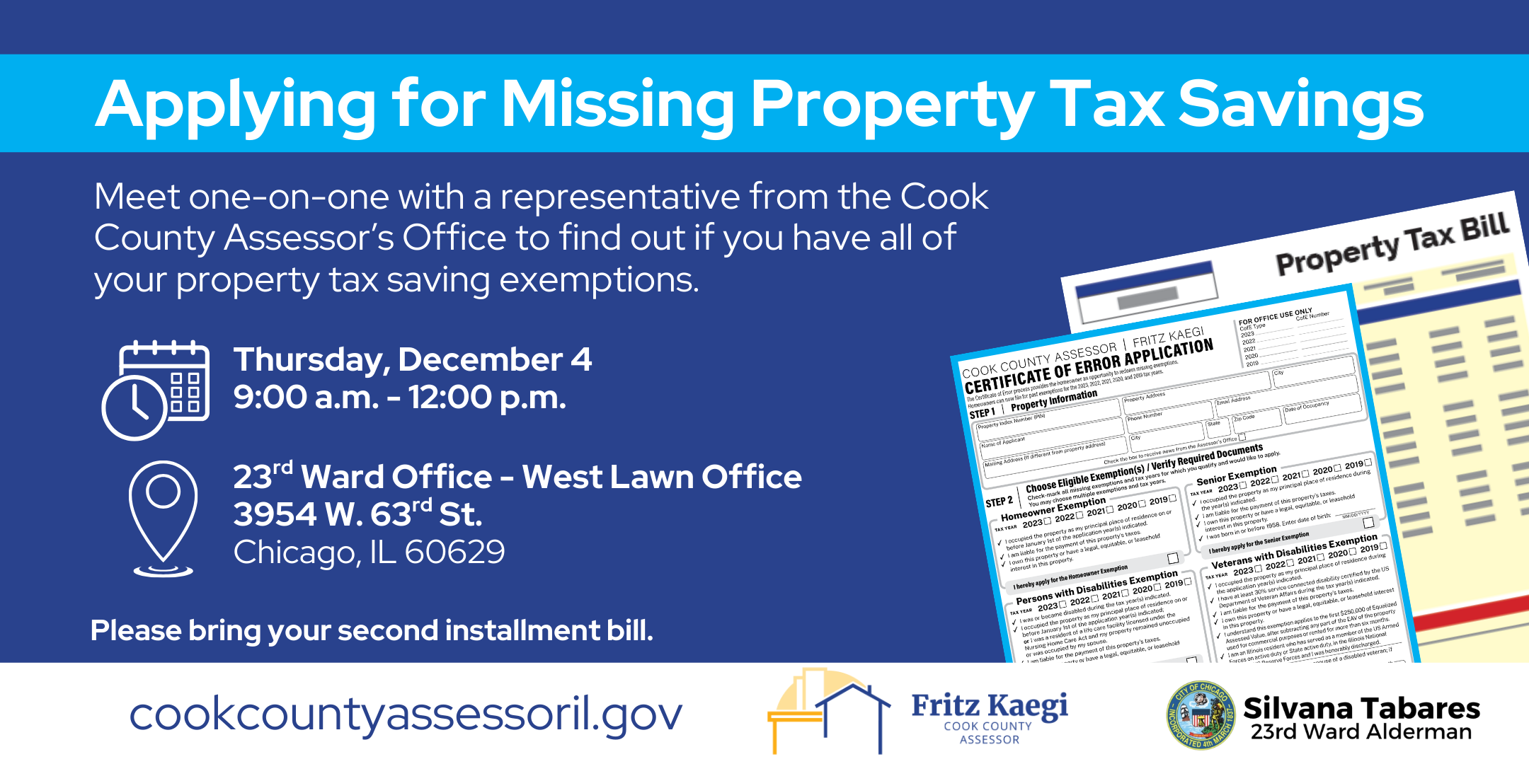 Meet one-on-one with a representative from the Cook County Assessor’s Office to find out if you have all of your property tax saving exemptions.